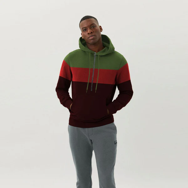 Fashion trendy contrast color combined panels on front and sleeves.
